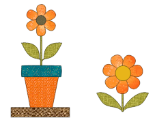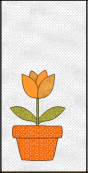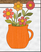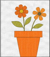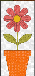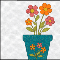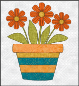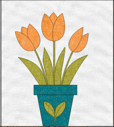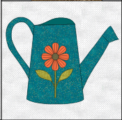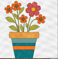 This cheerful quilt features playful potted flowers and watering cans arranged on shelves, framed with a colorful patchwork border. A fun and easy project for applique lovers, perfect for brightening up any space. Finished size: 52" x 58"